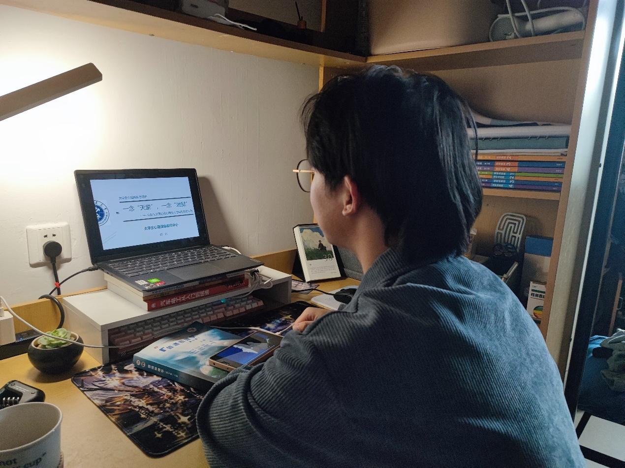 胡泊老师以“一念‘天堂’,一念‘地狱’”为主题,从“科学的心理健康观”、“身心健康的自我评估”、“基于认知主义原则自助或助人”三个方面开展讲座。他从“心理健康”“生理健康”两方面分析“何为健康”,以疫情期间的心理健康状态波动为切入点,从行为、思维和感受等多方面分析具体心理状态示例,详细介绍身心健康“三要素、五指标”等自我判断方法,提醒同学们及时关注、调节自我心理健康状态。胡泊老师从认知心理学视角出发,详细讲解外在刺激到心理障碍的过程,运用思维情绪记录单分析具体事例,强调由思维调整控制自我情绪变化。最后,他指出大学生朋辈心理工作应当遵循“量力而行、自助助人、修正认知、积极宣泄、初级干预、及时上报”等原则,希望能为同学们的心理健康保驾护航。