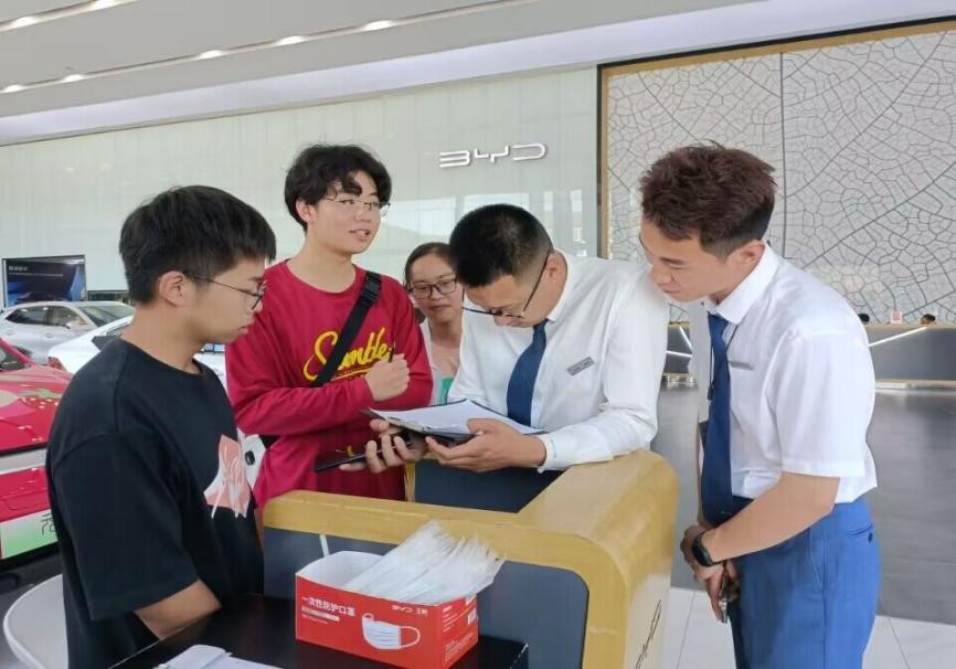 团队抵达比亚迪店后,由工作人员带领参观,通过一些具体的参数表和参观讲解,让队员们对新能源汽车都有了一个初步的了解。随后,针对新能源汽车,队员们又向工作人员提出了一些问题,比如它的优势和劣势所在、新能源汽车的前景如何等,工作人员也都一一做出解释和回答。最后,队员们将调研问题和调研结果进行收集、整理,此次调研活动圆满结束。